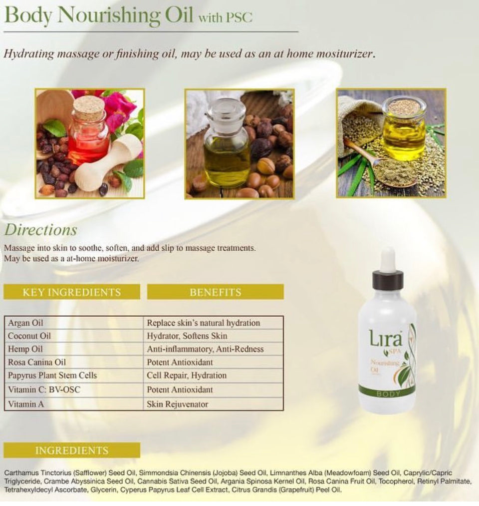 Restore precious hydration for ultimate skin health with the Lira Spa Nourishing Oil. This multi-functional luxury hydrator contains a blend of exotic oils, vitamins and botanicals to balance and revitalize full body. Aging doesn’t stop at the face and neither should your skincare routine. The Lira SPA Body Collection provides products that exfoliate, brighten, hydrate, firm and nourish skin from head-to-toe.