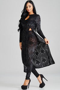 Look smoking hot in this two piece set! A burnout velvet long front slits top with keyhole and leggings–you'll turn heads like it's nobodies business! Show off your edgy style with this majorly sultry, yet sophisticated ensemble. Ready, set, slay!