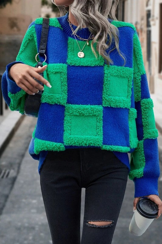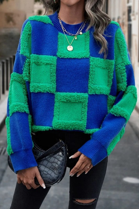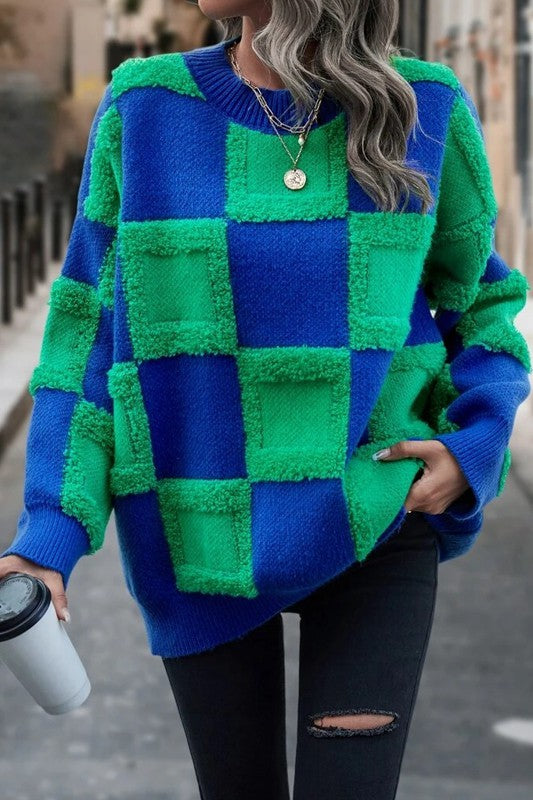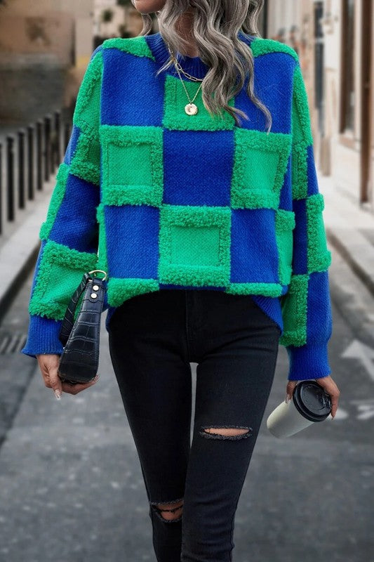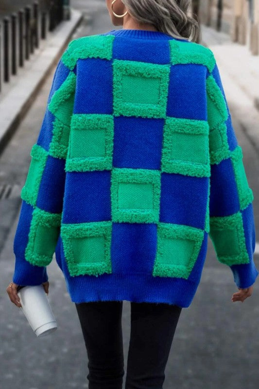 Chunky Big Plaid Terrycloth 3D Knitted Sweater