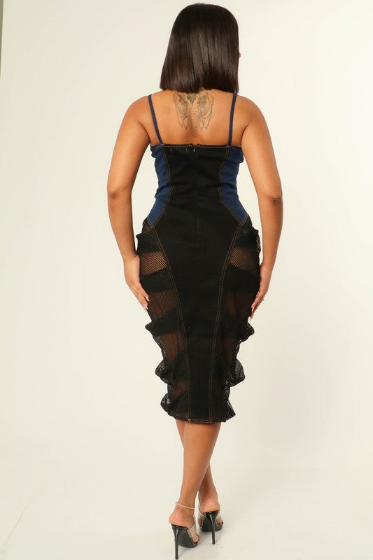 Denim and Mesh Panel Spaghetti Strap Midi Dress
