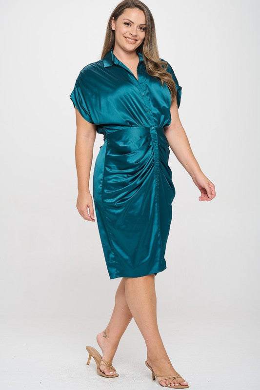 Elevate your wardrobe with our Junior Plus Button Down Ruched Shirt Dress. This sophisticated piece features a button-down design and ruched details for a flattering silhouette. Perfect for any occasion, it exudes elegance and exclusivity. Embrace luxury with this must-have dress.