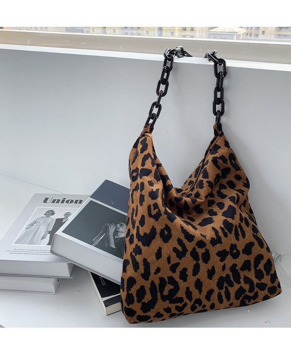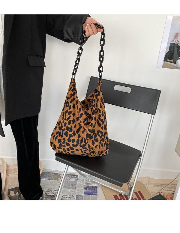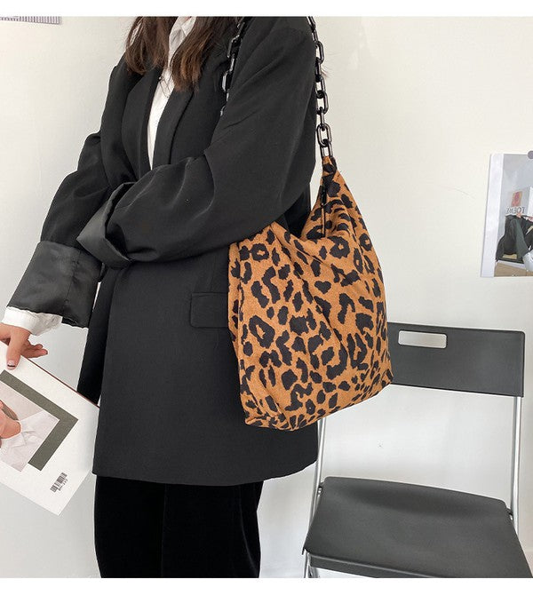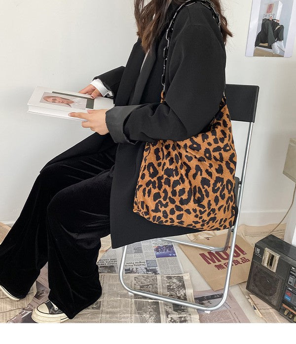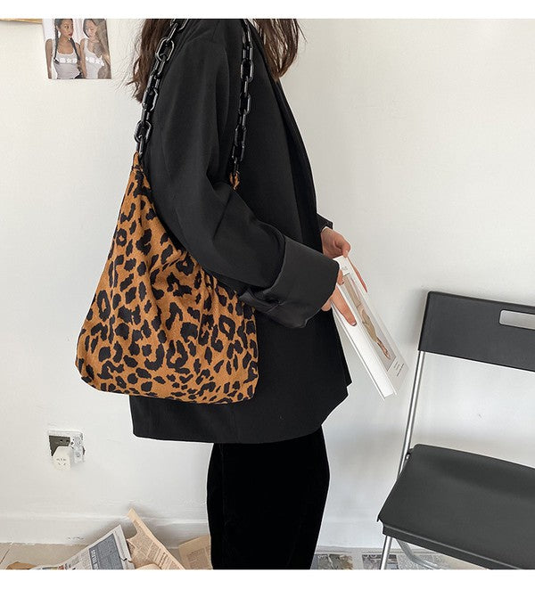 Leopard Print Corduroy Shoulder Tote with Chain Strap