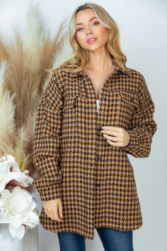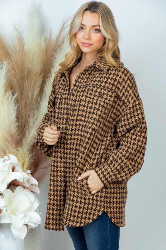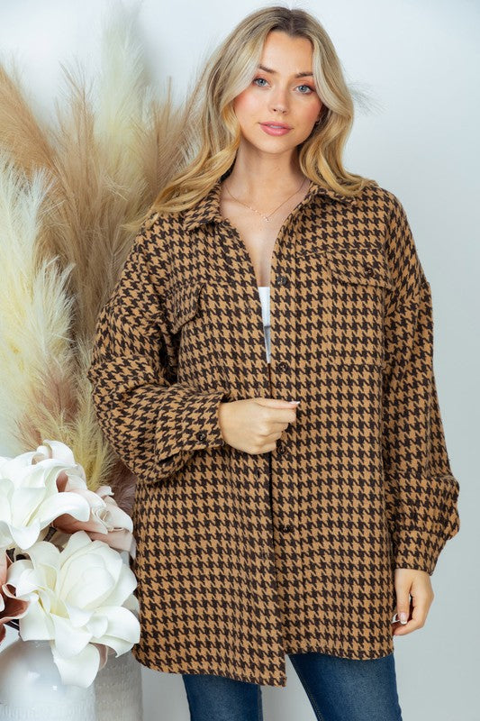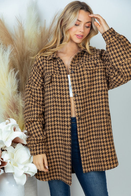 A long sleeve houndstooth woven jacket with a collared button-down front featuring pockets and a relaxed fit. Fabric is a lightweight woven material.