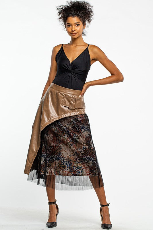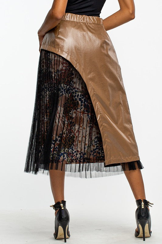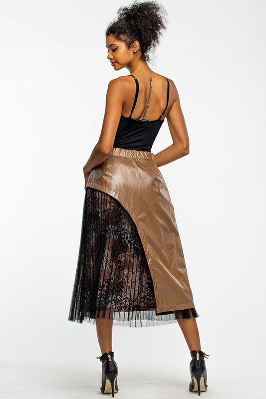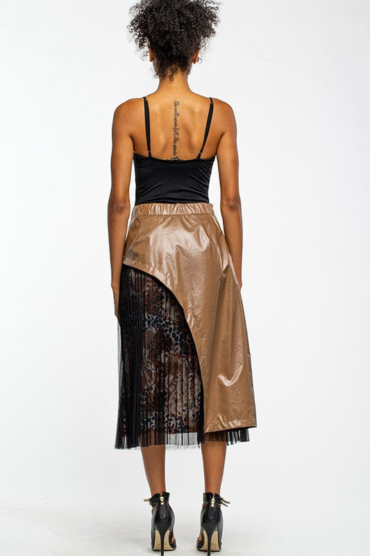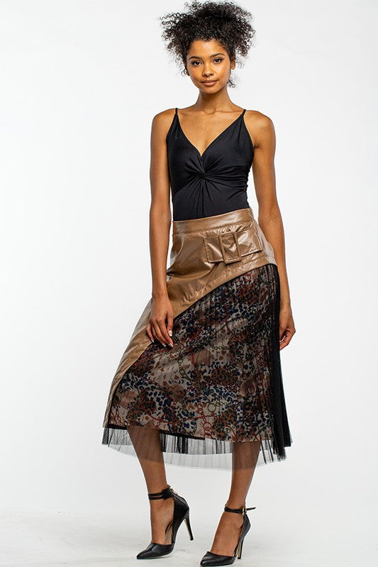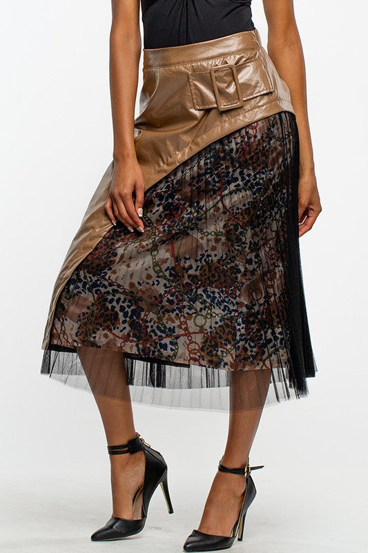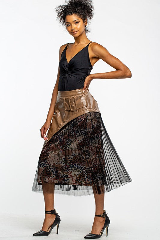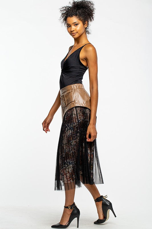 Upgrade your wardrobe with our Mesh and Faux Mixed Leather Material Skirt. Made from the finest materials, this skirt combines the edginess of leather with the elegance of mesh, for a sophisticated and unique look. Elevate your style with this luxurious and exclusive piece.