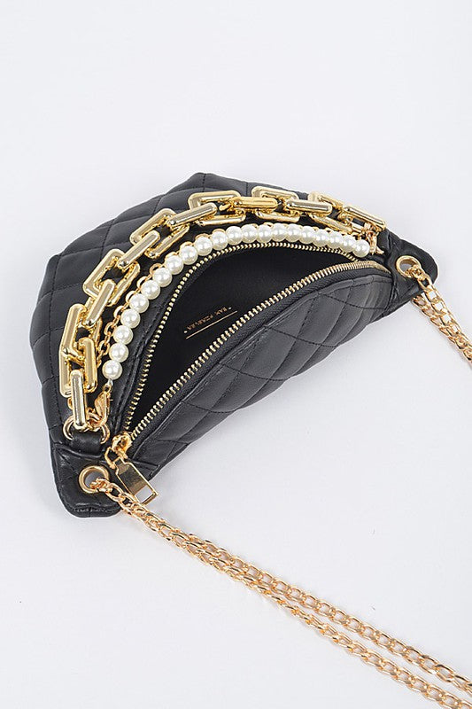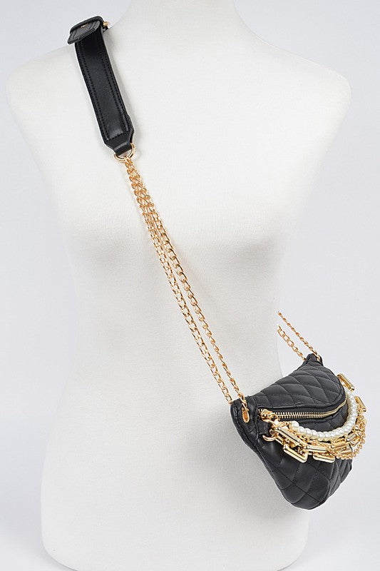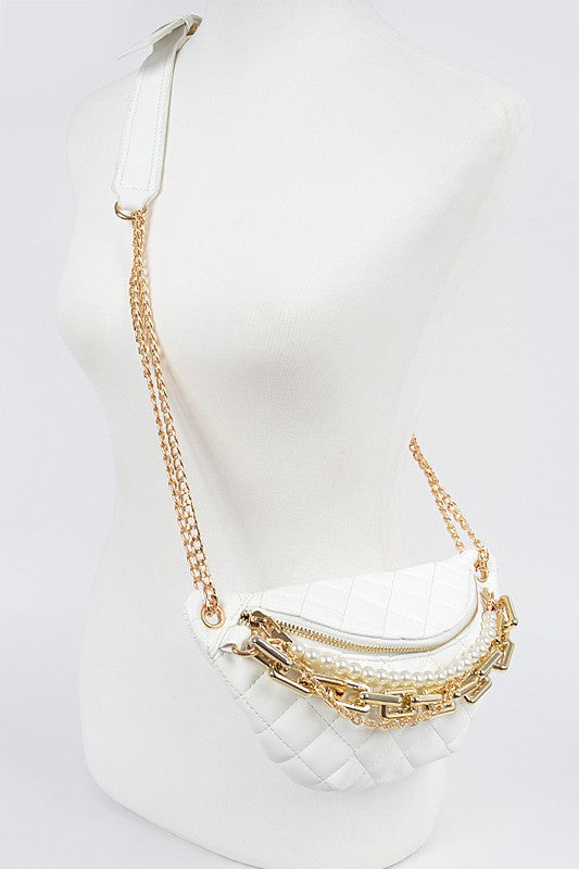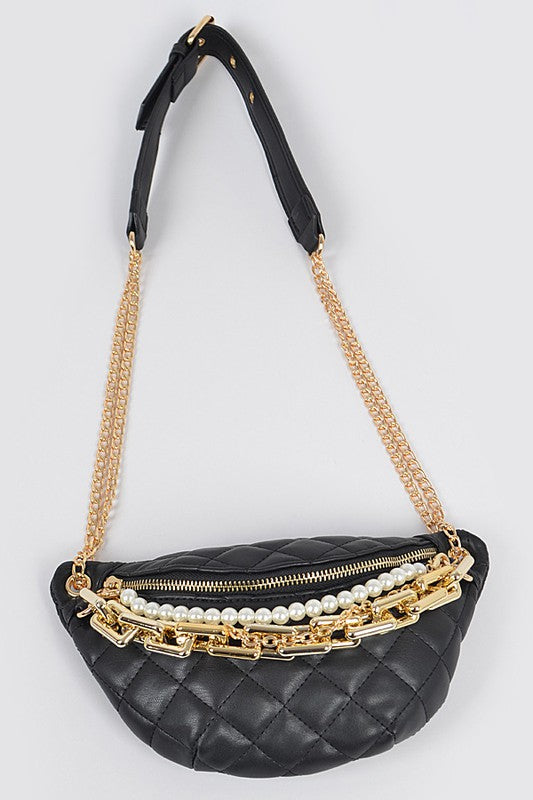 Live your life on the wild side! Make a statement with this bold Multi Chain & Pearl Fanny Pack, ideal for an adventurous lifestyle. Featuring a multi-chain exterior, adorned with pearls - make a bold step and stand out from the crowd!