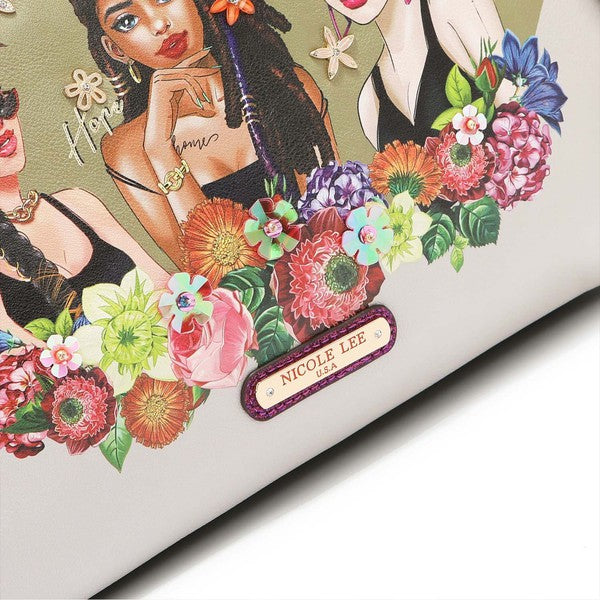 Front design is embellished with multi-colored plastic and enamel flowers accented with diamond rhinestone studs