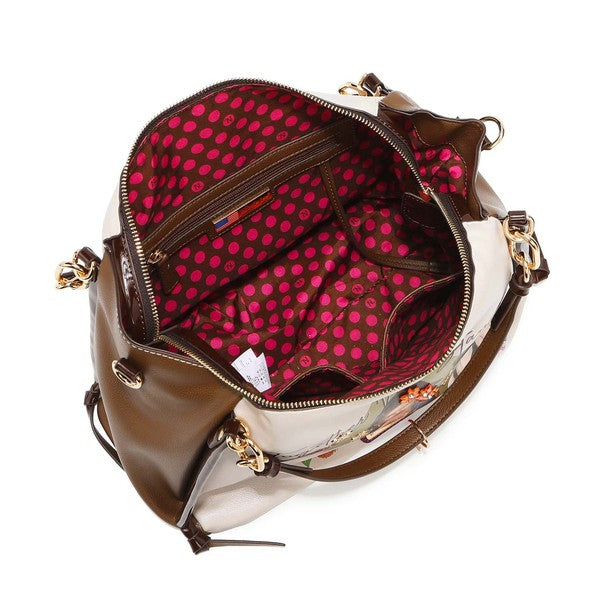 Pebbled vegan leather exterior with glossy patent leather trim and accents