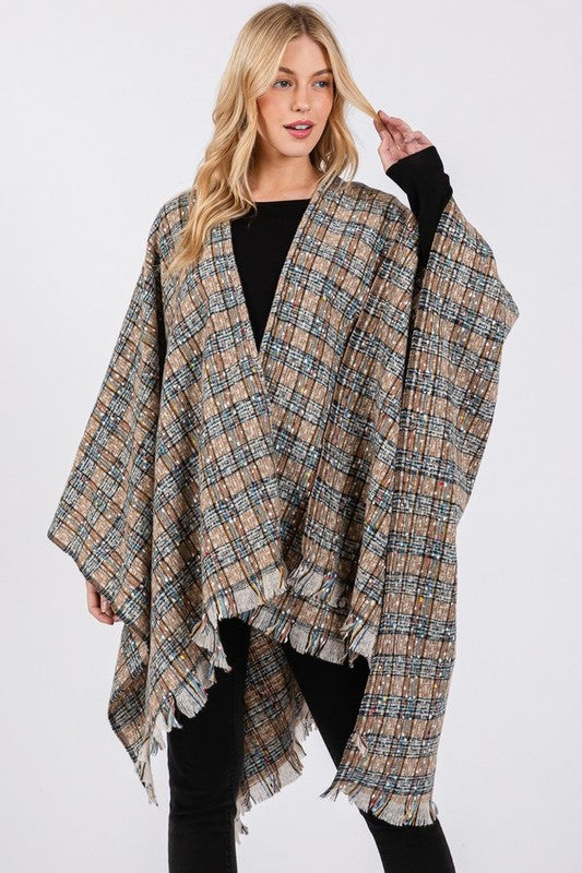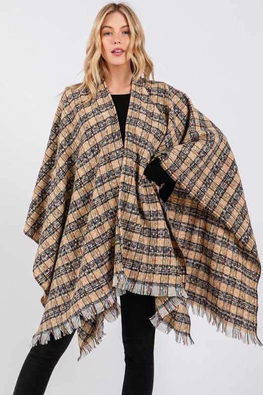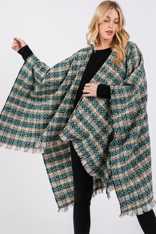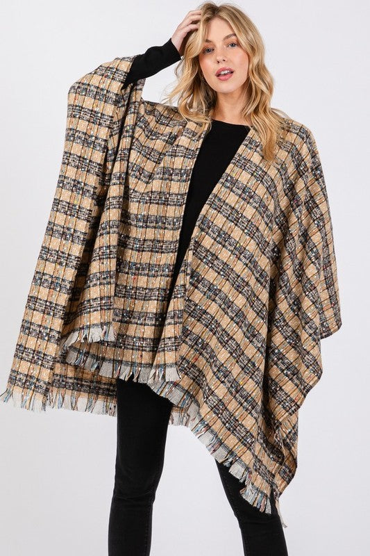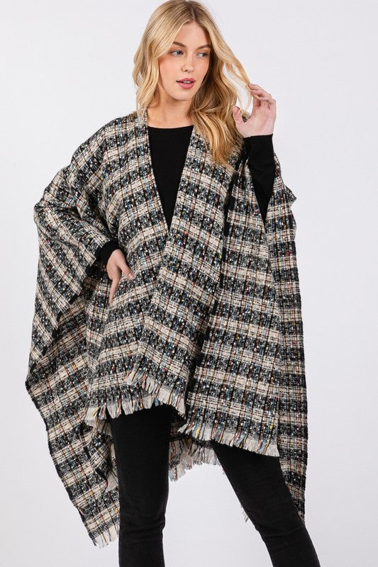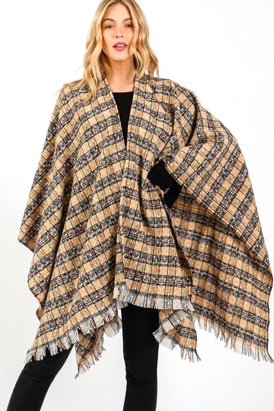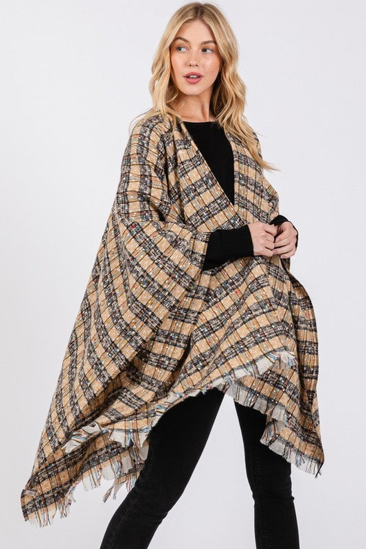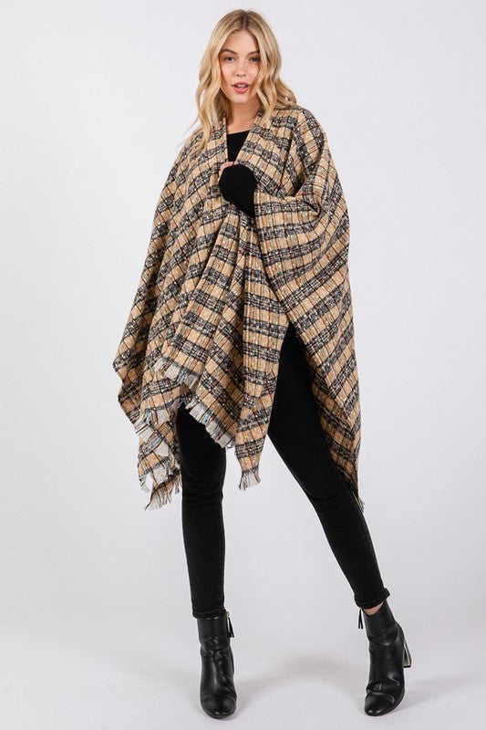 Indulge in luxurious sophistication with our Oversize Plaid Ruana Cardigan. This must-have piece features a raw edge design and a captivating plaid pattern. Wrap yourself in ultimate style and comfort with this exclusive cardigan.