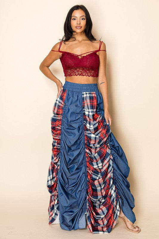 Indulge in the luxurious combination of plaid and denim with our Maxi Skirt. The drawstrings not only add a touch of elegance but also allow for a customized fit. Perfect for a chic and sophisticated look, this skirt will effortlessly elevate your style.