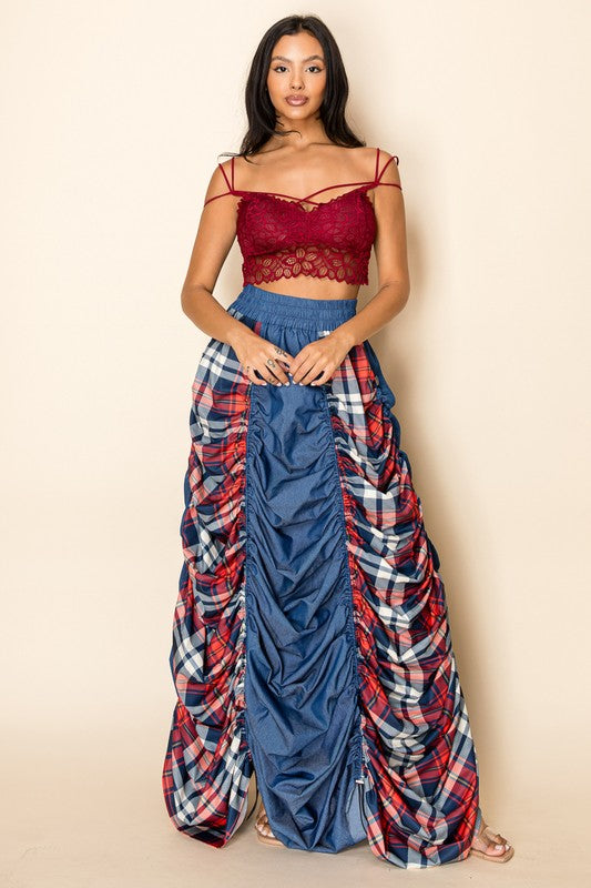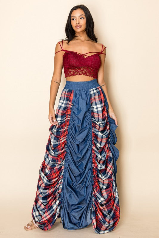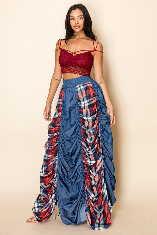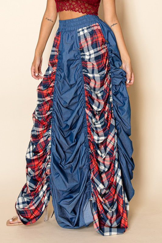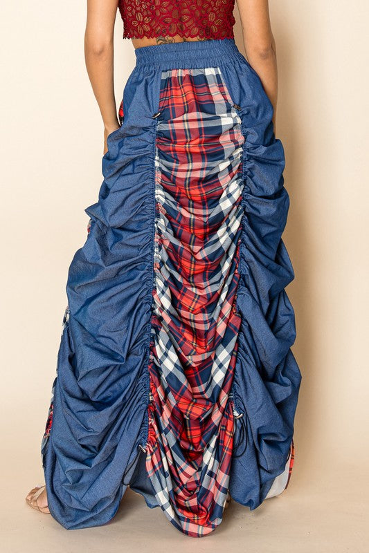 Plaid and Denim Maxi Skirt with Drawstrings