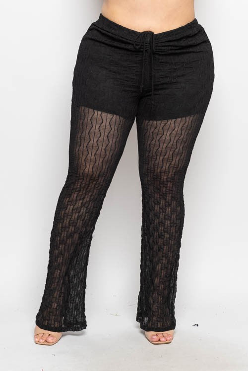 Plus Size Textured Mesh Lined Elastic Waist Flare Leg Pants