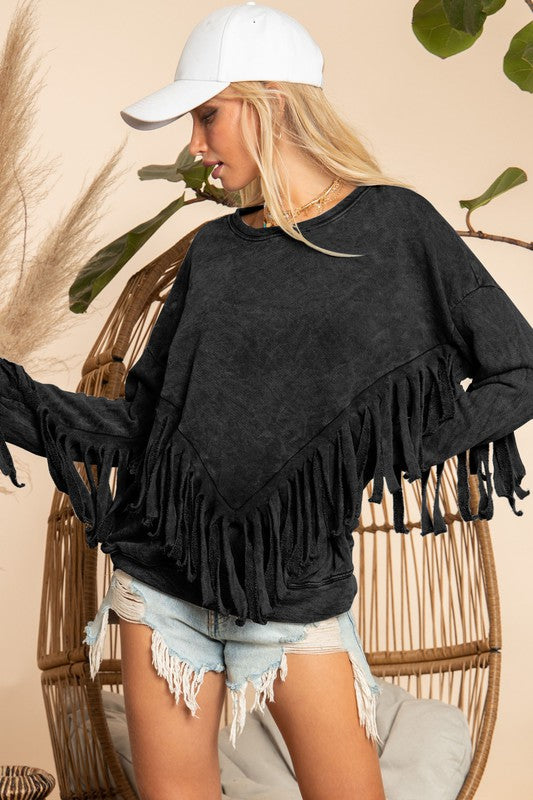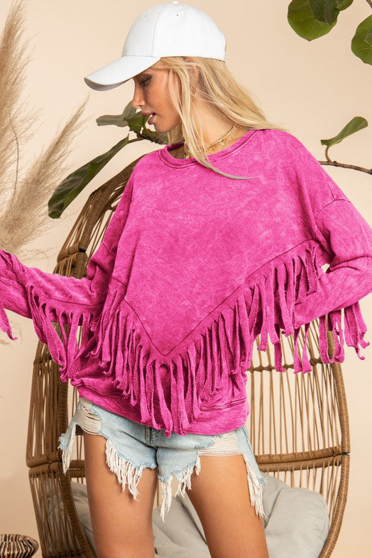 Get cozy and stylish with our Side Fringe Mineral French Terry Washed Sweatshirt! Made from soft, mineral-washed terry fabric, this sweatshirt features playful side fringe for a unique and fun twist. Perfect for adding some flair to your casual wardrobe. (Warning: may cause spontaneous dancing!)