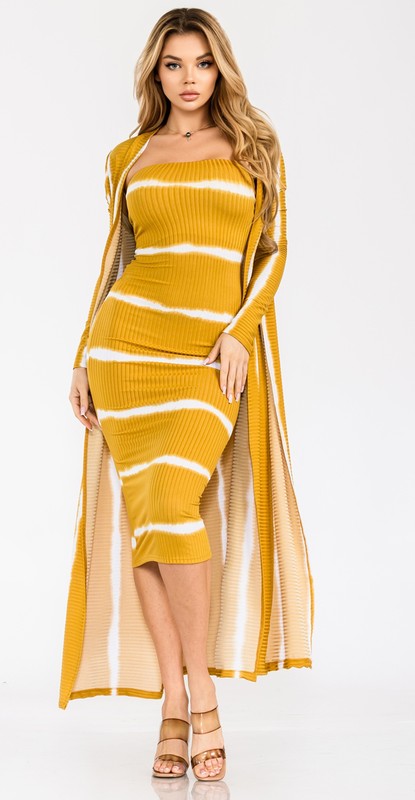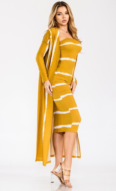 -2 PIECE SET (CARDIGAN & TUBE DRESS) -KNITTED RIB FABRIC -SLIT -KNEE LENGTH -STRETCH -MODEL IS 5'8" AND WEARING A SMALL