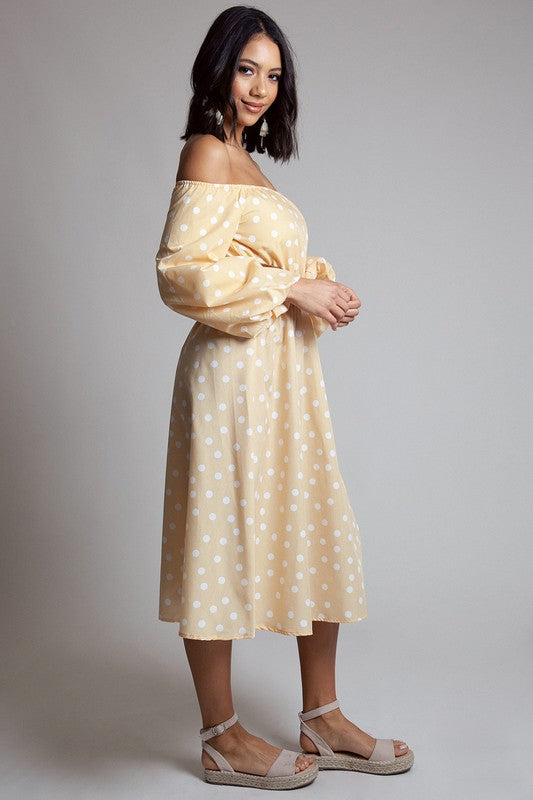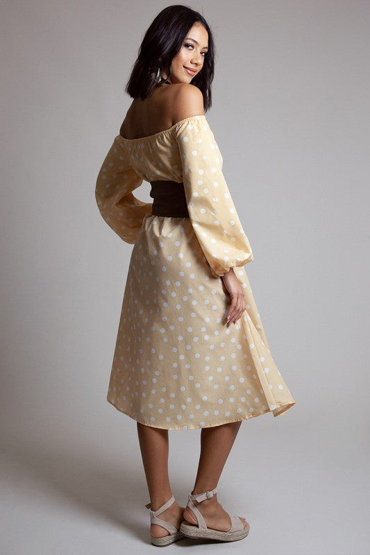 This beautiful off-the-shoulder midi dress comes in a lightweight polka dot print yellow fabric and features long bubble sleeves and a faux leather belt accessory.